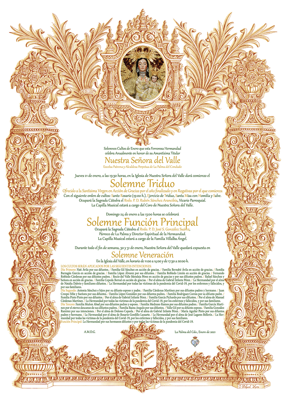 - La liturgia estará presidida por el Rvdo. P. D. José S. González Suárez, Párroco de La Palma y Director Espiritual; y por el Rvdo. P. D. Rubén Sánchez Arancibia, Vicario Parroquial.